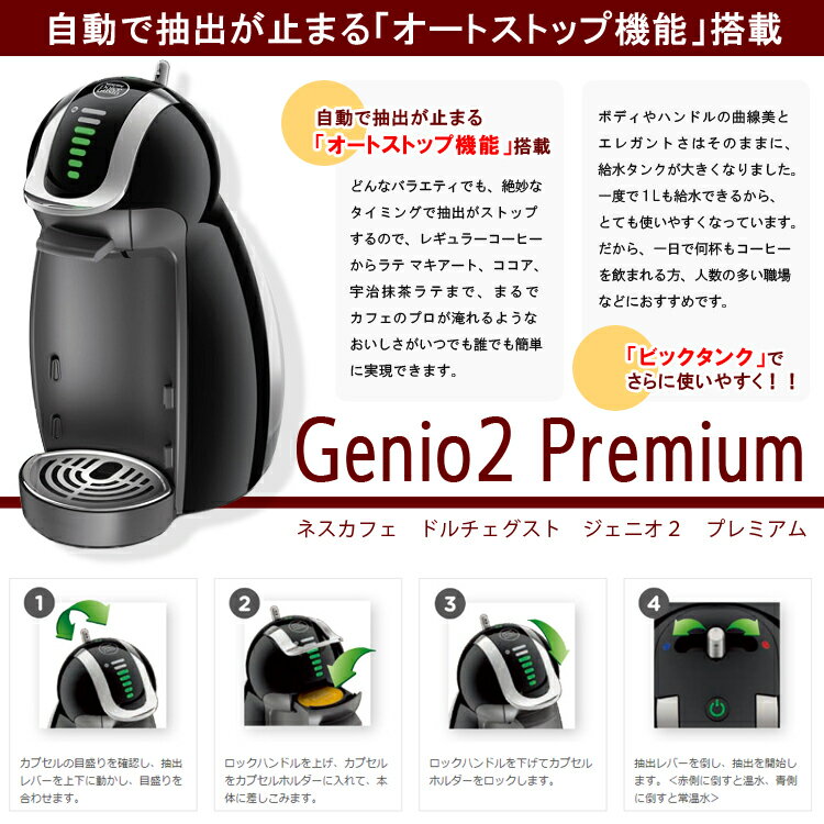メーカーネスレ nestle品名ドルチェ グスト ジェニオ2 プレミアム ピアノブラック 本体 MD9771-PB品番又はJANコードJAN:4902201415835サイズ-重量-商品説明●自動で抽出が止まる「オートストップ機能」搭載「ネスカフェ ドルチェ グスト」 ジェニオモデルは、抽出が自動で止まる「オートストップ機能」を搭載しました。