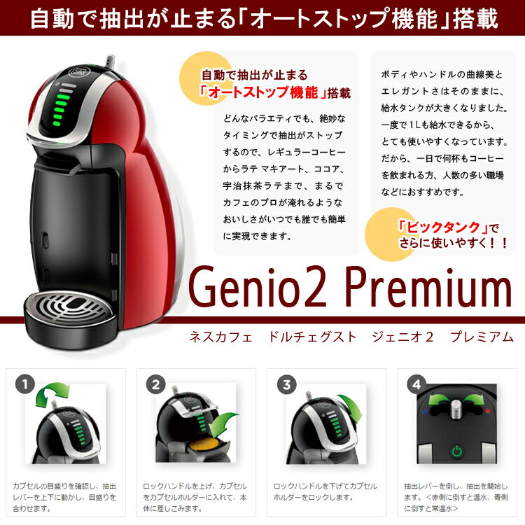 メーカーネスレ nestle品名ドルチェ グスト ジェニオ2 プレミアム ワインレッド 本体 MD9771-WR品番又はJANコードJAN:4902201415828サイズ-重量-商品説明●自動で抽出が止まる「オートストップ機能」搭載「ネスカフェ ドルチェ グスト」 ジェニオモデルは、抽出が自動で止まる「オートストップ機能」を搭載しました。